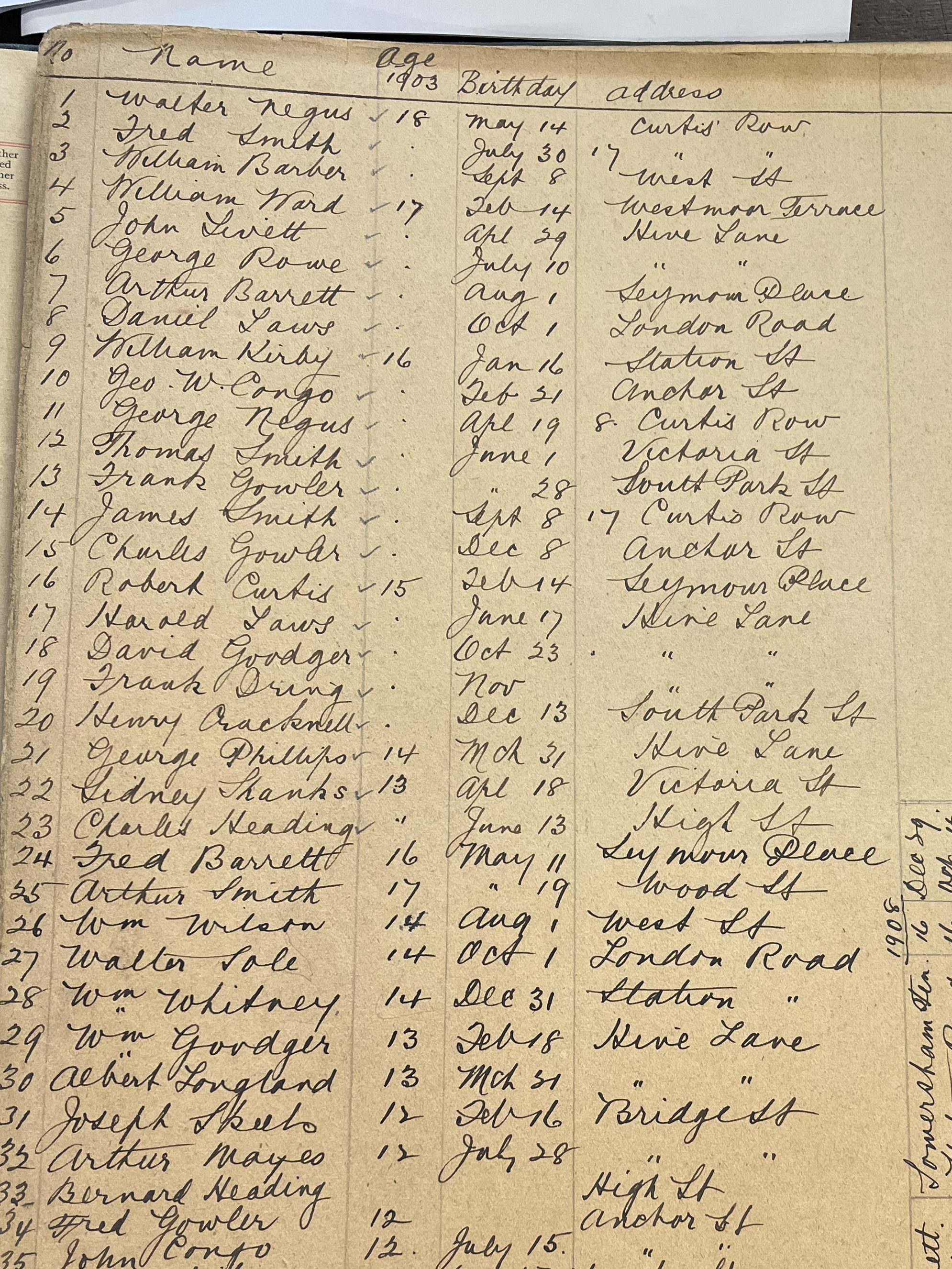 The archives at Chatteris Museum are a treasure trove of documents about the life of the town. In 1903 a list was made of all the boys then attending the Sunday School. (A note was added in 1908 with a few more names, the total number coming to 46.) This list, kept in the Museum, is invaluable for family historians because it lists not only the boys’ names, but their ages, birthdays and addresses. Their stories can then be traced.